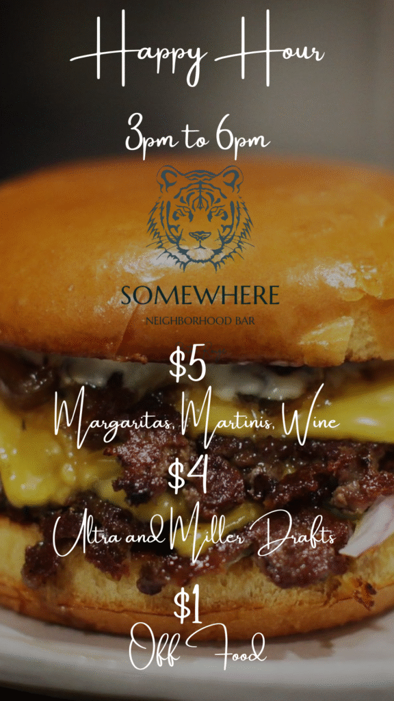 $5 double well$4 Martinis$3 wines 2×1 draft beers$1 off all food.